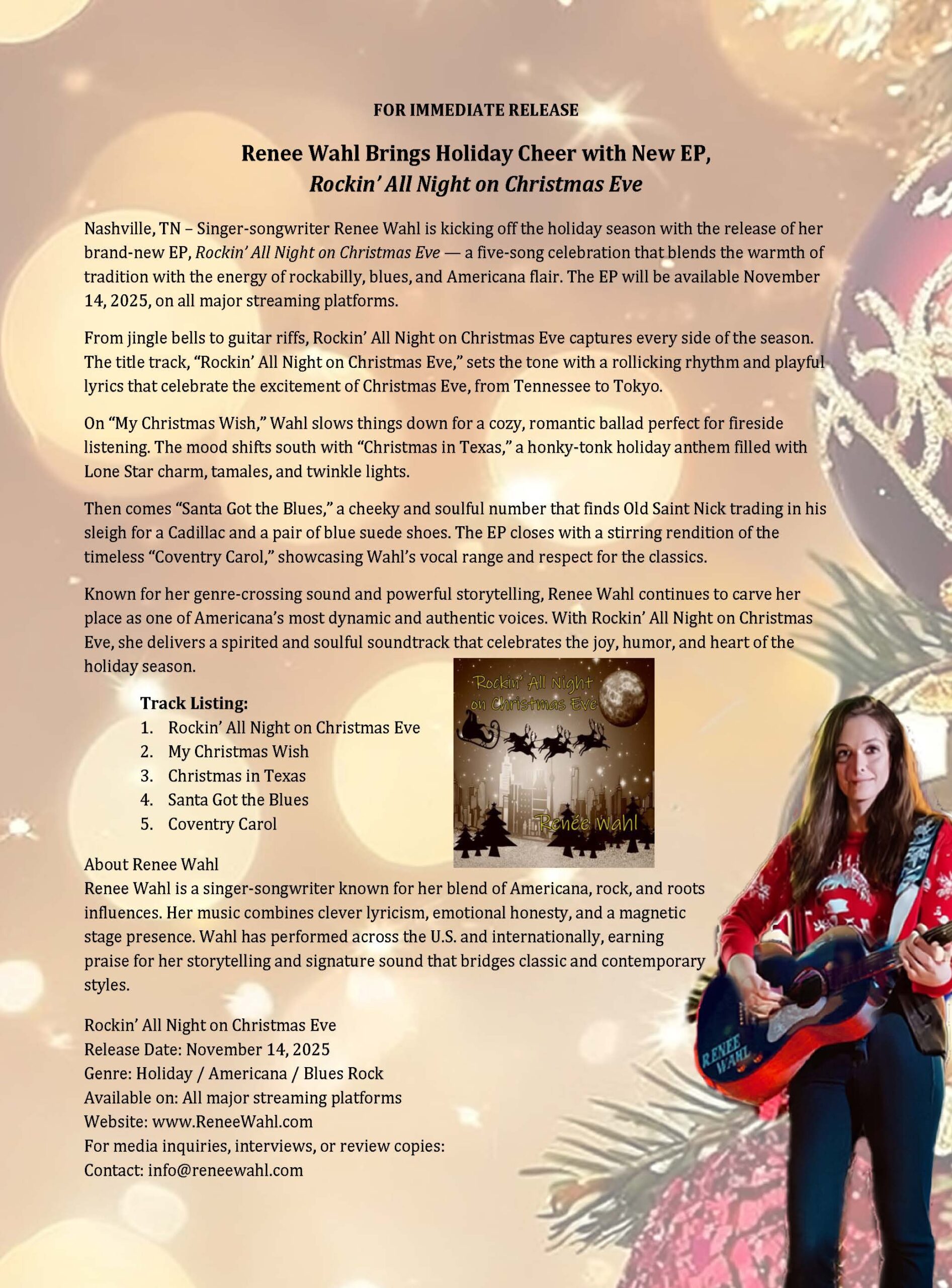 Nashville, TN – Singer-songwriter Renee Wahl is kicking off the holiday season with the release of her brand-new EP, Rockin’ All Night on Christmas Eve — a five-song celebration that blends the warmth of tradition with the energy of rockabilly, blues, and Americana flair. The EP will be available November 14, 2025, on all major streaming platforms.
